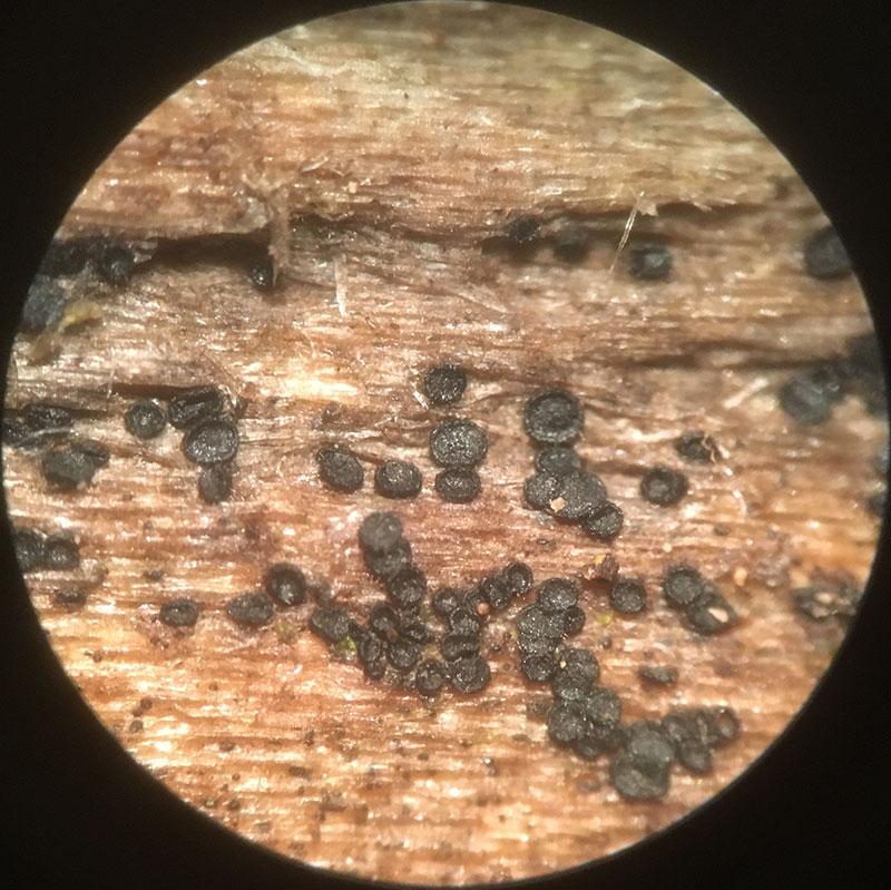 Found yesterday in New York City. Substrate is a large decorticated, fairly-well rotted branch of unknown hardwood. The cups are about .5mm in diameter and black. Asci are IKI- measuring about 75-99 x 7.5-9µm. Spores are hyaline, ellipsoid with tapering ends, mostly non-septate, but I saw one 1-septate spore. They measure (8-) 10-14 x 3.5-4.5µm. Paraphyses are surrounded by brown material, filiform with swollen tips, the tips about 3µm wide. The closest I could find is Durella commutata. But maybe this is not correct.
