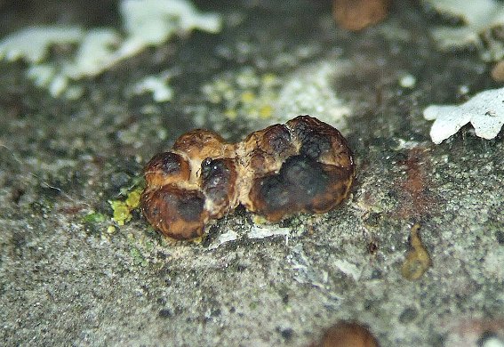 Macro : Masses arrondies roses à brunes, "craquelée" de noir, jusqu'à 2mm de diamètre. L'intérieur rose semble être constitué de deux couches : la première entourant la deuxième qui contient les conidiospores.