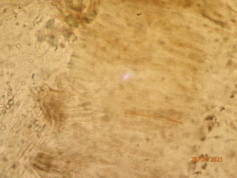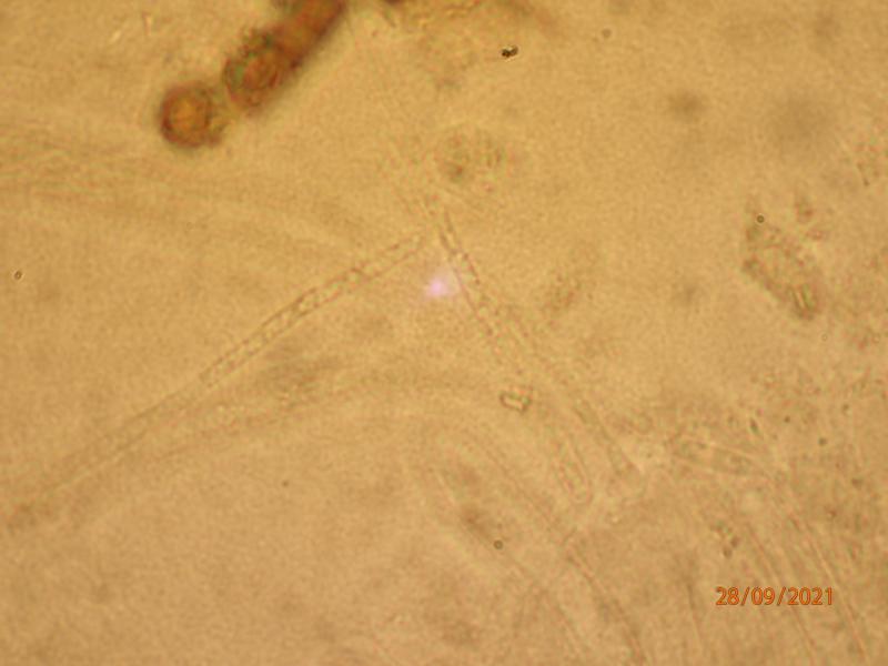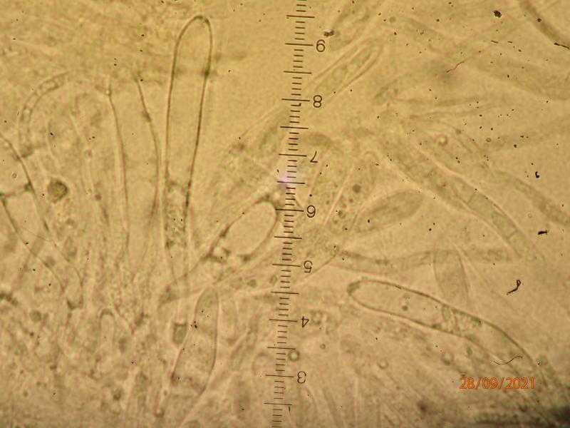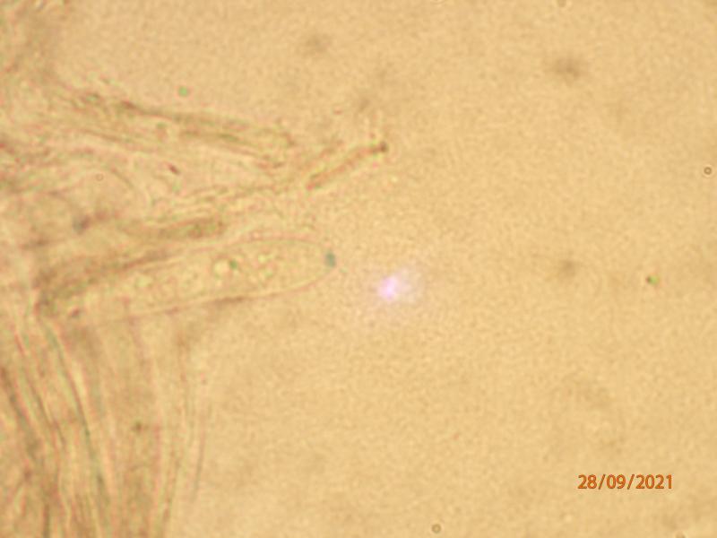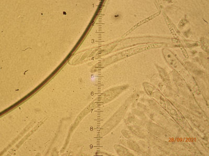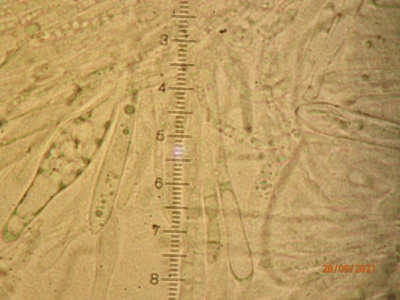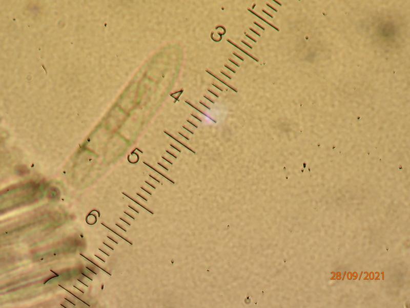Sub-mm apothecia on Picea abies cone in tall-herb spruce forest in Northern Norway. Stalks stout and black. Hymenium greyish. Excipulum easy to cut, but appearing "blurry" in the microscope, consisting of pale brownish or hyaline, parallel hyphae, I think textura oblita or if not, then t. porrecta. Asci IKI+ (blue in Lugol), clavate, 55-75 x 5-6 micr., spores 8-10 x 3 micr, 1-septate, aguttulate. Paraphyses cylindrical, multiguttulate. No croziers seen. All images (except last one i Lugol) and measures are in water.