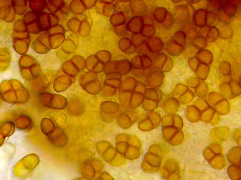Conidia subtriangular to square or irregular, composed of 3-4 subglobose cells; 10-13x8-10x7-8 µm, with constricted septa, smooth, rust coloured.