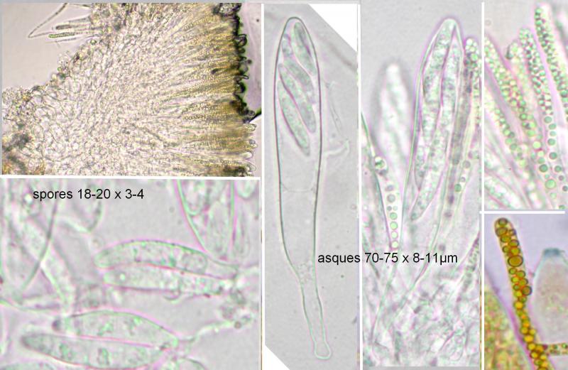 Asques IKI + de type Calycina, H+, à 8 spores, 70-75 x 8-11, PS 45-50.