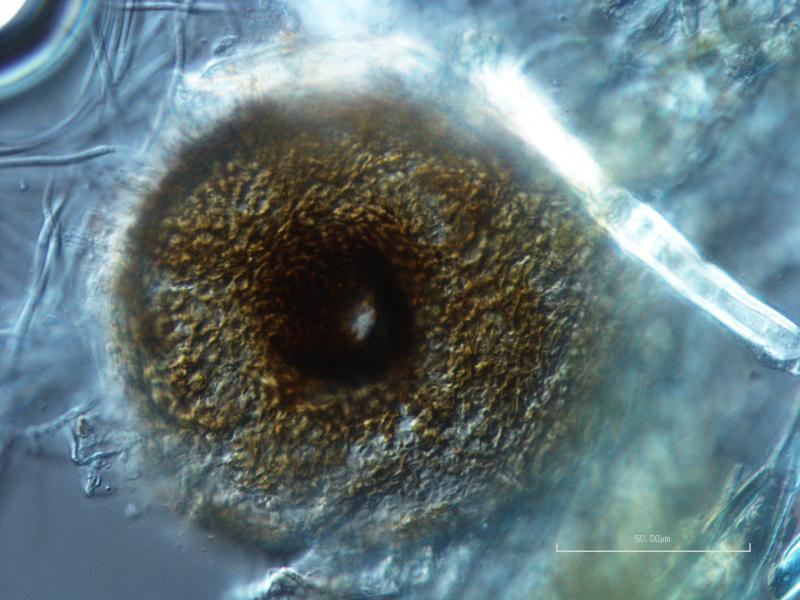 Hello! I wanted to share a fascinating thing I saw this week. This is the coelomycete anamorph state of pyrenolichen Phyllocharis orbicularis (=Strigula orbicularis), which is apparently not illustrated anywhere. I was lucky enough to be able to ask Robert Lücking for help, and he ID'd it right away, having seen it before; when I asked where I could find an illustration, he admitted that he didn't think one existed, only the ascomata and the macromorphology of the thallus. The thallus of this particular example is somewhat poorly lichenized, and looks more like the photobiont (Cephaleuros virescens) than the typical thallus, but the conidia are the really fun part anyway.The conidia are hyaline, 4- to 6-septate, 40-45 x 2-3.5 ?m excluding the appendages, with a non-cellular, mucoid appendage at each end, which are quite variable in length, but generally less than 10 ?m, and often curving into a hook. Conidiophores are small, lageniform, reduced to conidiogenous cells, and integrated into the inner wall of the pycnidium.