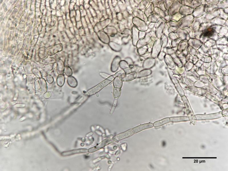 Abundant simple hyaline conidia were formed, measuring around 4-4.5 x 1.5-1.8.
