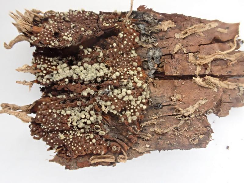 Have you considered Hypoxylon rubiginosum, anamorph growing out from its teleomorph?