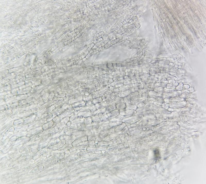 Paraphyses with some diffuse internal content, non-refractive, cylindrical, 1-1,5 µm broad, tips slighetly bent and up to 2 µm broad, branched.