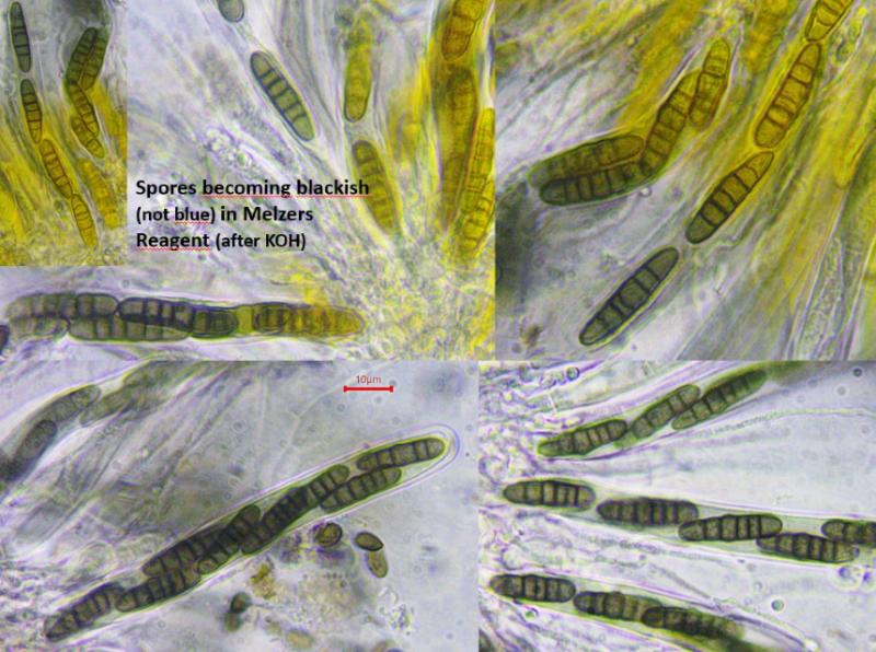 Take a look at Phaeosphaeriopsis obtusispora, as the spores blacken in Lugols, the size fits and the key was the central cell slightly larger than the rest. Looked at Leptospharia also as this is a key feature of spores in that genera also. Or in and around Phaeosphaeriaceae. Just an option perhaps,