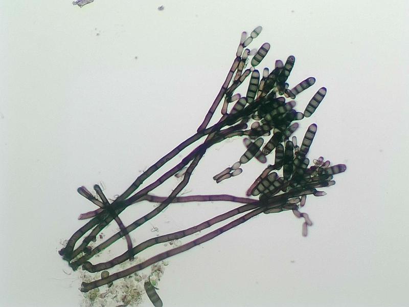 Conidies 3 à 5 septa, couleur proche de celle des spores.