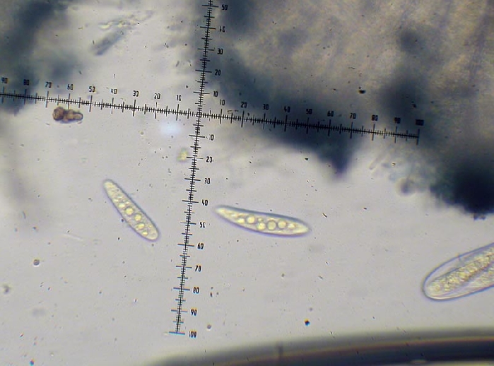 Why not merely P. atrata? Hawksworth and Kutorga (1997) gave the wide range of (20-) 30-45 (58) x (6-)7-9(12) µm for the spores of this taxon. You should also check the number of septa, they gave 5-11.