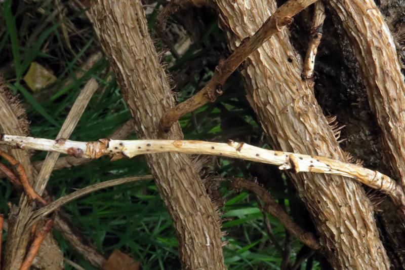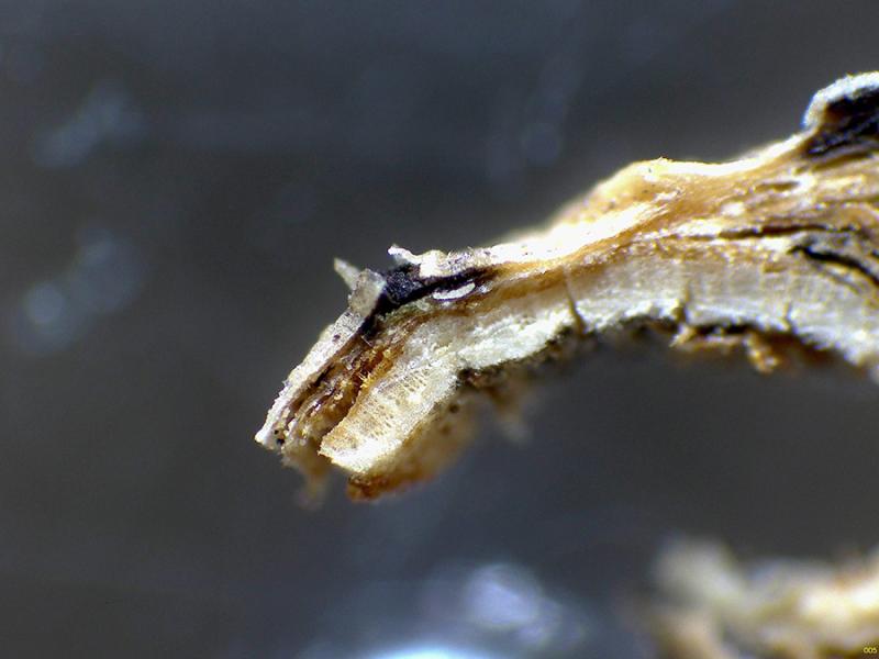 Tiny blackish ascomata shaped like erumpent grains
