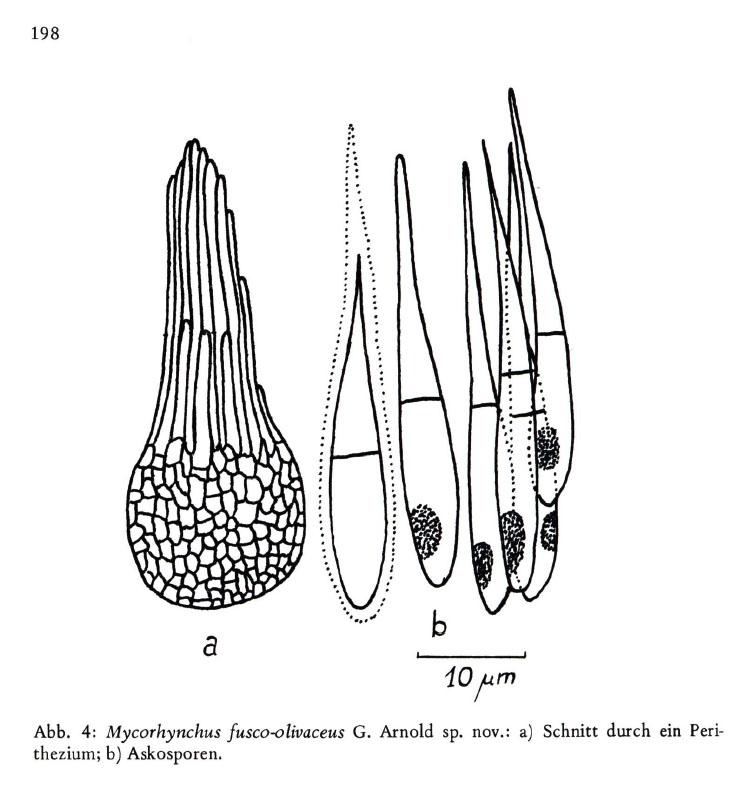 Mycorhynchus fusco-olivaceus G. Arnold (Pyxidiophora fusco-olivacea) on Inonotus
