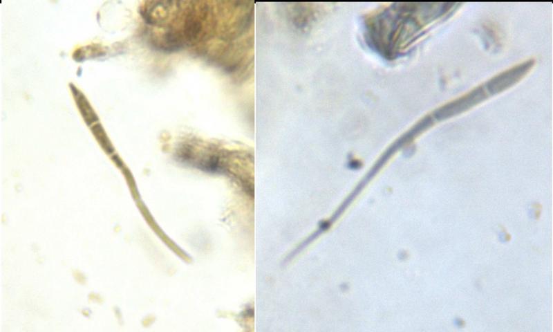 Spore: needle-shaped, stretched, (21.4) 23.6 - 27.2 (27.5) × (1.4) 1.7 - 2.1 µm, no septa, only in IKI 2 septa;