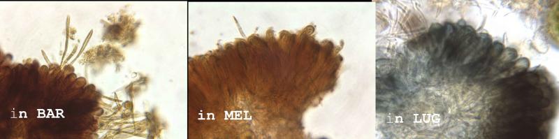 Asci: club-shaped, thick-walled, 27 x 6.5 µm; reddish-brown in Meltzer and Baral's solution, blue-black in Lugol's solution;