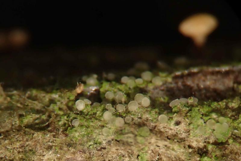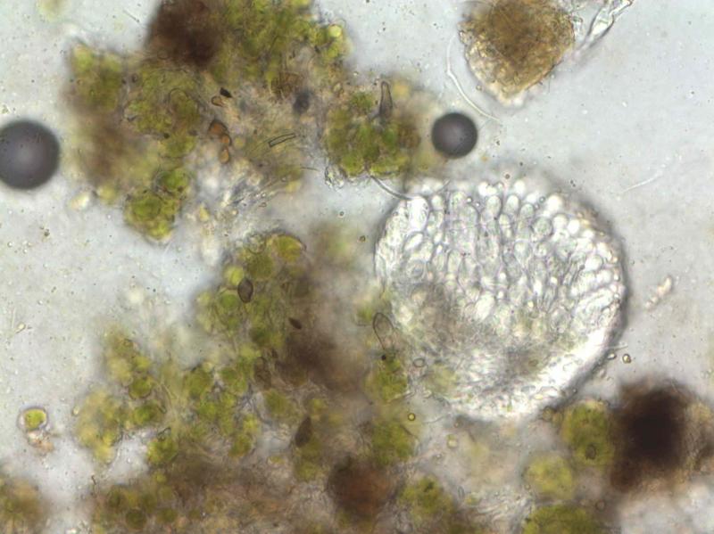 On a mat of dried algae/lichens, loosely attached to a herbeceous stem, I found several very small, dirty gray fruiting bodies (diameter 155 to 220 µm), sitting on the substrate.