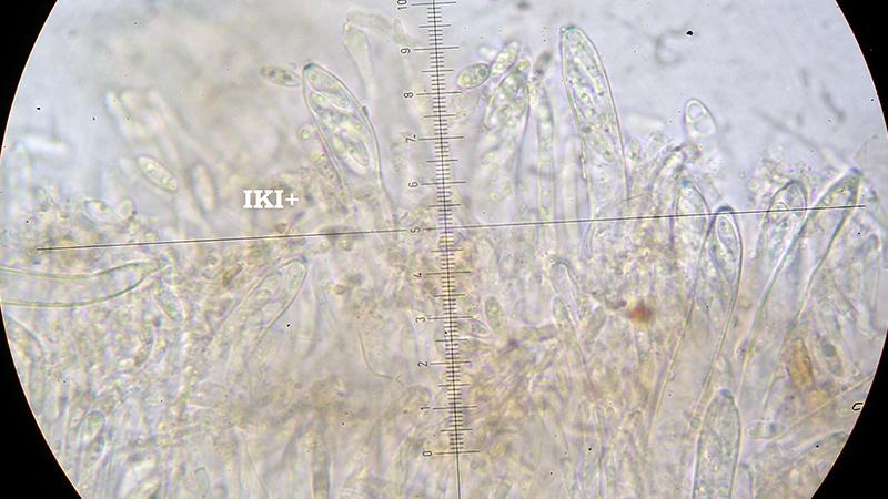 Octosporic asci with amyloid apical pores. Fusiform spores, smooth sometimes with a septum, measuring 10.6-13.9 x 3.5-4.5 µm.