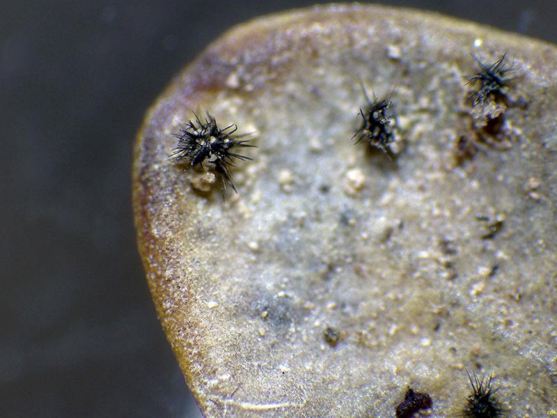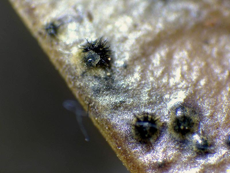 An anamorph resembling Capronia is sprouting on the surface of decaying Buxus sempervirens leaves in the soil, sharing space with ascomata that are supposedly Ceuthospora buxi, although this is still unconfirmed. The ascomata are blackish, with a diameter of 100 to 280 microns (excluding the hairs). Some of the external hairs exceed 250 microns in length and are 6 to 8 microns wide at their base. These thick-walled, septate hairs contain intracellular pigment and end in rounded shapes.