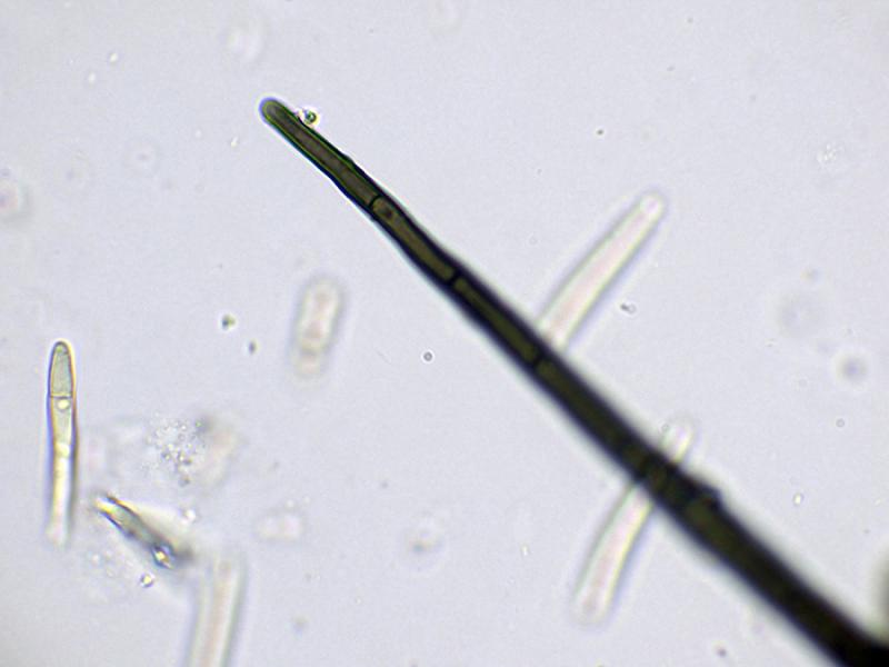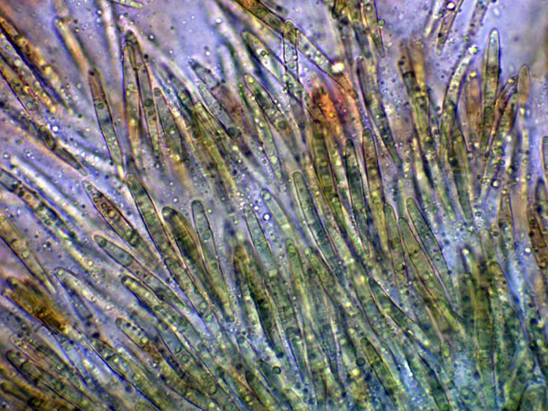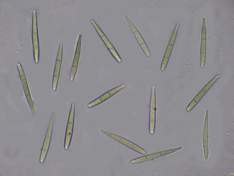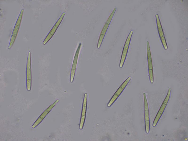 Conidiogenous hyphae are difficult to observe, but a vertical palisade arrangement is discernible. These hyphae produce fusiform conidia with a more pointed end, mostly with two septa and, exceptionally, some with three. These septa are more visible in Melzer's reagent and show no signs of constriction. Measurements of these conidia in water are: