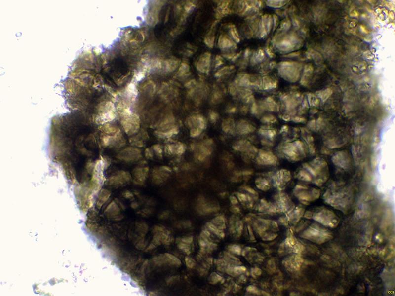 The perithecium wall has a globose-angular texture and is heavily pigmented.