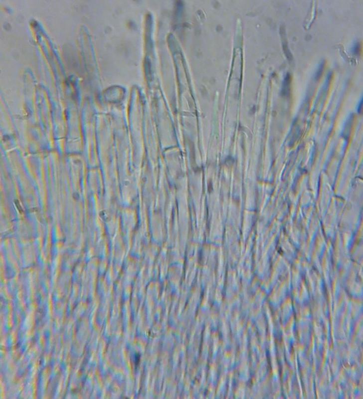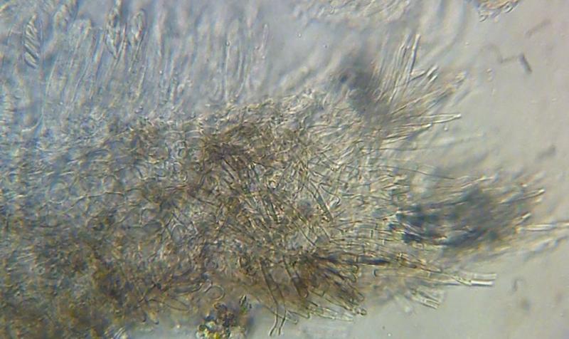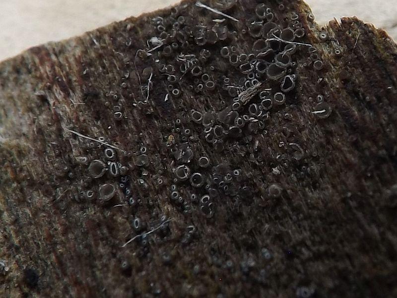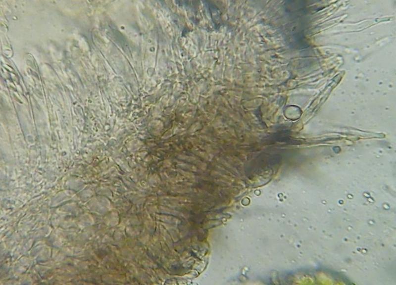 Macrofeatures similar to Mollisia but definitely not the same genus. They grew on debarked wood of Salix sp. Ascomata maximum of 0.5-0.6 mm. The outer cells are brown but the marginal hairs hyaline. Perhaps the fruiting bodies are too young, but the spores are already well developed.