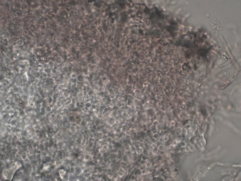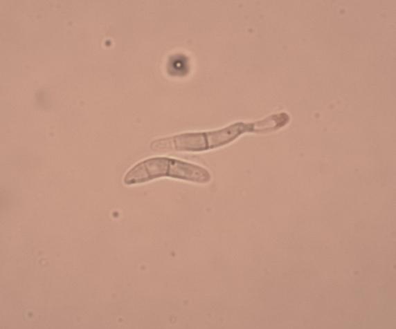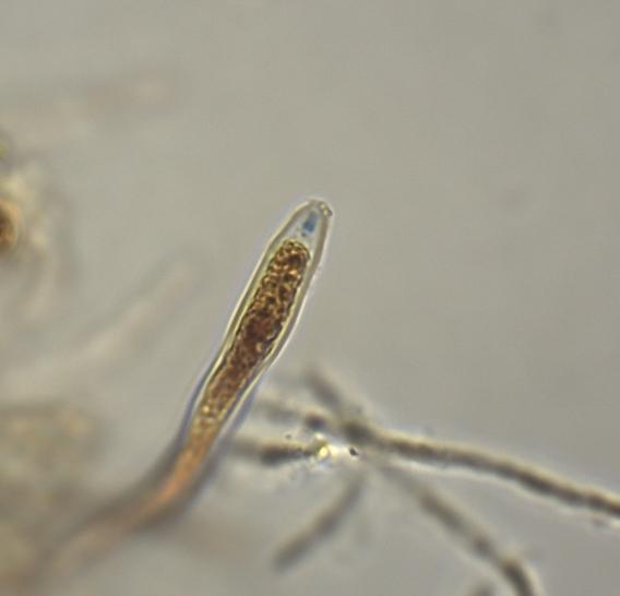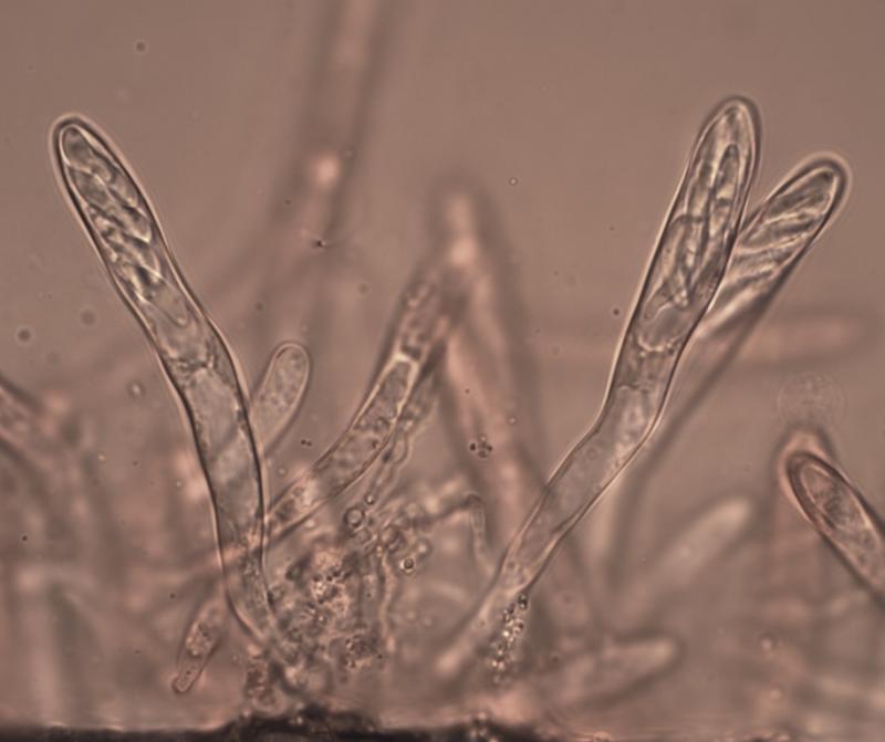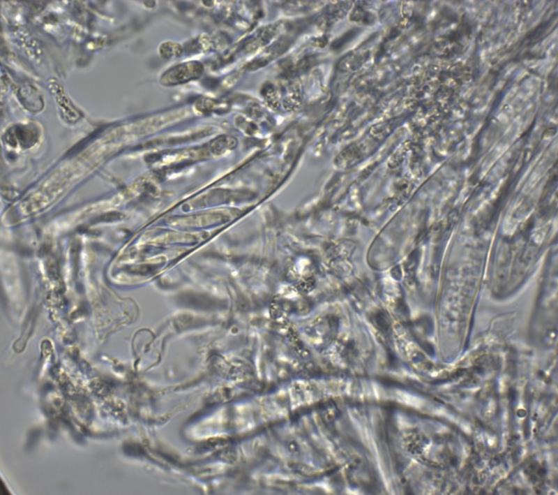 Asques 55-70 x 8 µm, avec crochet à la base (H+), IKI bleu (2 traits ou 2 points), contenant 8 spores bisériées. Pars sporifera 22 – 30 µm. Paraphyses hyalines, tortueuses, à sommet englué dans une matière granuleuse. Spores hyalines, subcylindriques, souvent courbes, contenant quelques guttules, à 0 – 2 cloisons, (8) 10 – 13 (14) x 2 – 3 µm. Spores libres rares.