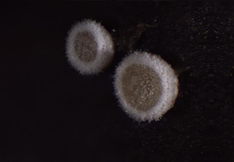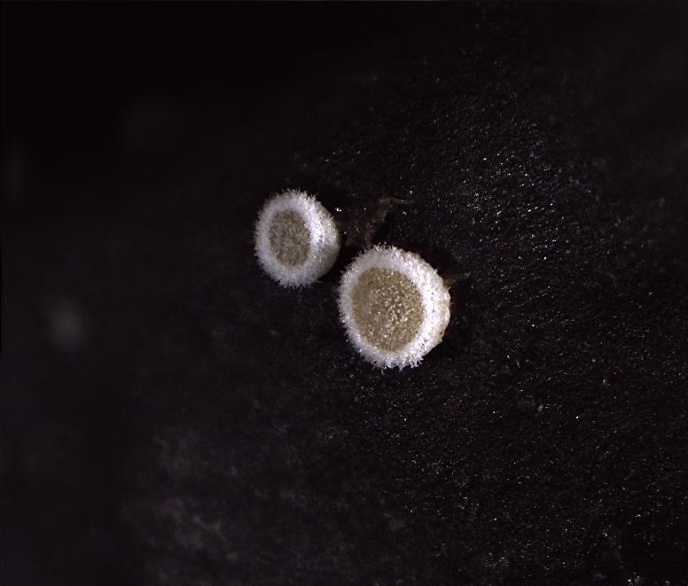 Apothécie de diamètre 500 µm par exemple, sessile, discoïde, à large marge blanche d'aspect cotonneux, à hyménium blanchâtre duveteux au début puis de plus en plus jaune orange.