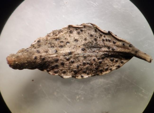 - Conidiomata black, pustular, on both sides of the leaf but mainly on the underside, 0,2-0,4 mm Ø; few specimen were sparsely 'hairy' (see photo's 5 and 6)