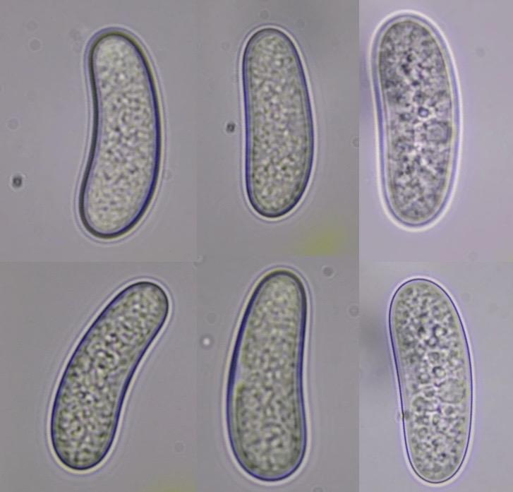 The ascospores are allantoid to ellipsoid and are filled with small guttules. The spore wall appears to be quite thick.