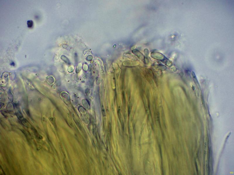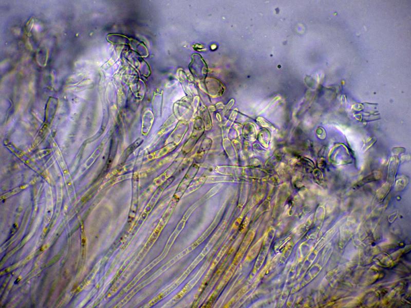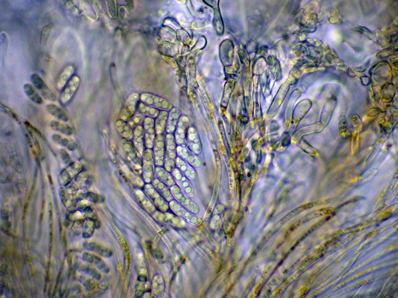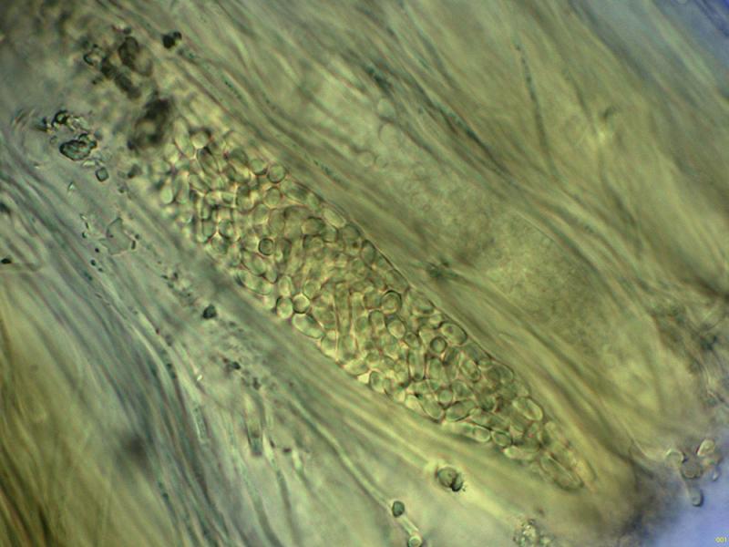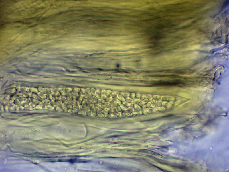 Sparse asci, containing more than 100 ascospores, with no apparent reaction to Melzer's reagent. Thread-like paraphyses with yellowish intracellular pigment, not protruding above the level of the asci, with short, broadened septa at their ends.