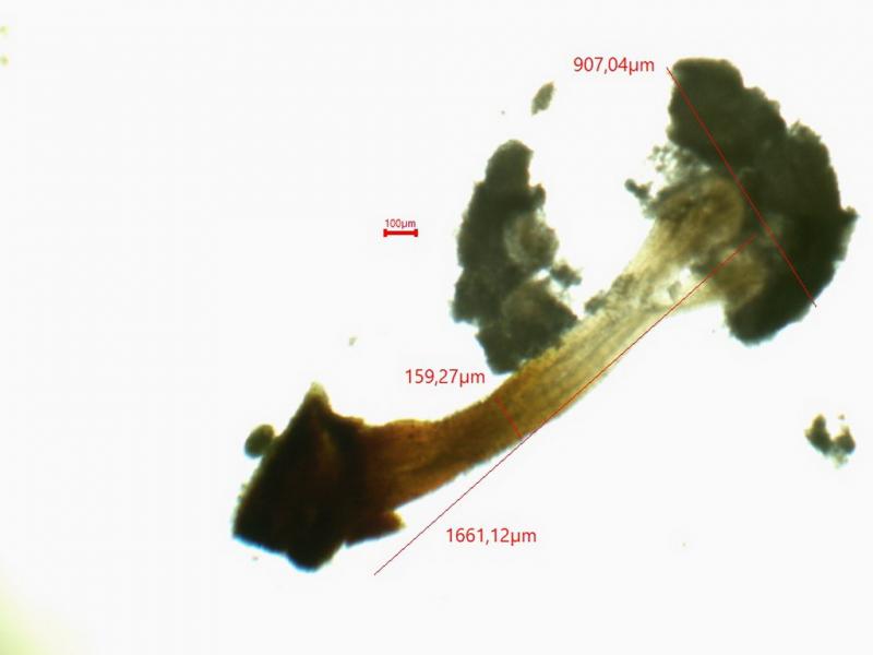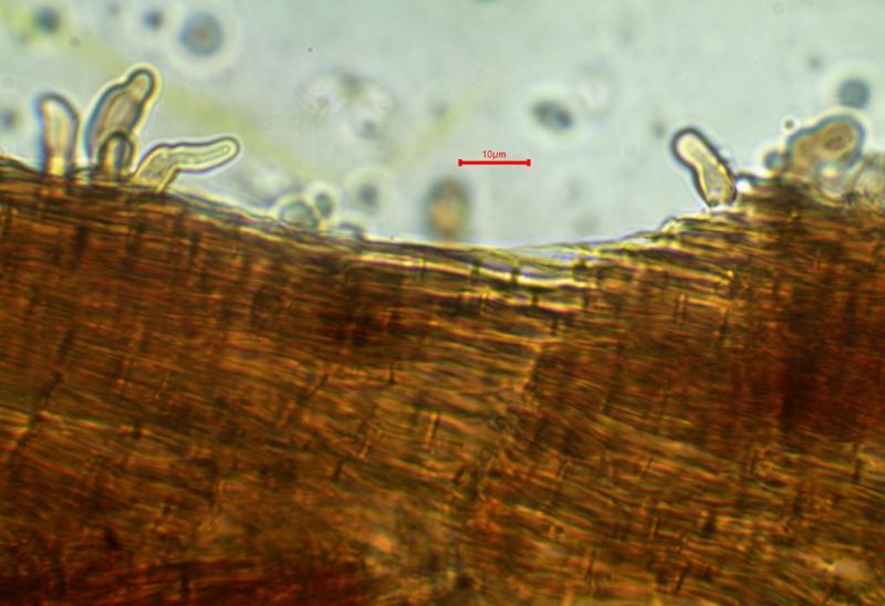 Une anamorphe rose stipitée, très nombreux synnema, stipe surmonté d'une tête globuleuse, stipe velu brun rouge plus foncé en bas, avec excroissances simples hyalines cylindriques à sinueuses, obtuses, à paroi épaisse parfois uniseptées, plus nombreuses vers la base, qqs unes plus longues branchues et septées (1-3 cloisons) à l'extrême base, le stipe de textura porrecta, hyphes colorés vers l'ext et incolores à l'int., hyphes stériles du stipe septés semblent pénétrer à l'intérieur du capitulum, capitulum conidiogène, conidiophore verticillé, conidies hyalines ou peu colorées, rose en masse, à paroi épaisse, ellipsoïdes lisses, 5-6x2.5-3.5µ, se formant à l'extrémité des branches du conidiophore, sur tronc mort debout de feuillu (frêne ?), en boisement riverain de Chalosse (40)