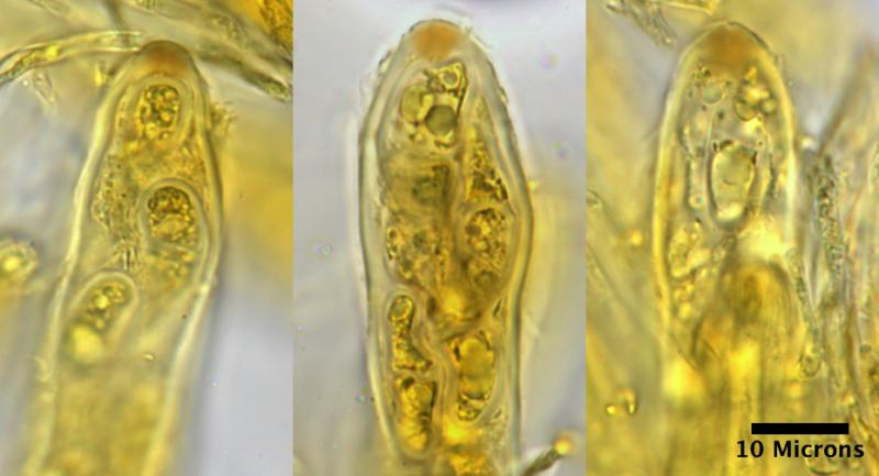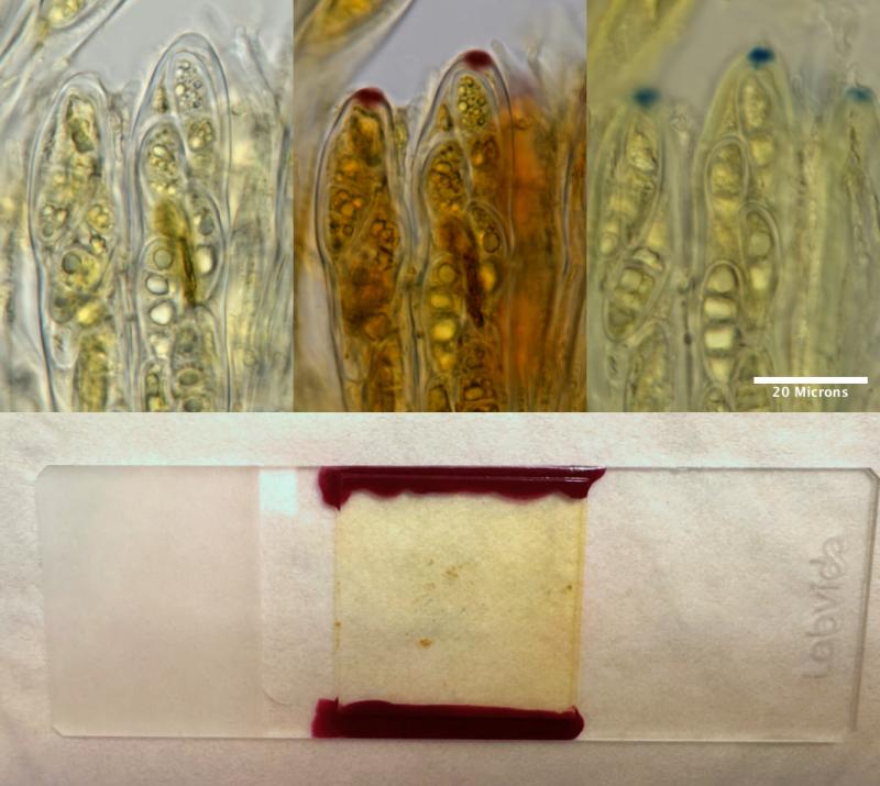 "combo.jpg" stained with 25% chloral hydrate and 1% iodine. The hemiamyloid reaction is clearly visible, but much reduced. It seems like the Chloral hydrate and Iodine "compete" for binding, with the chloral hydrate having a far stronger affinity.