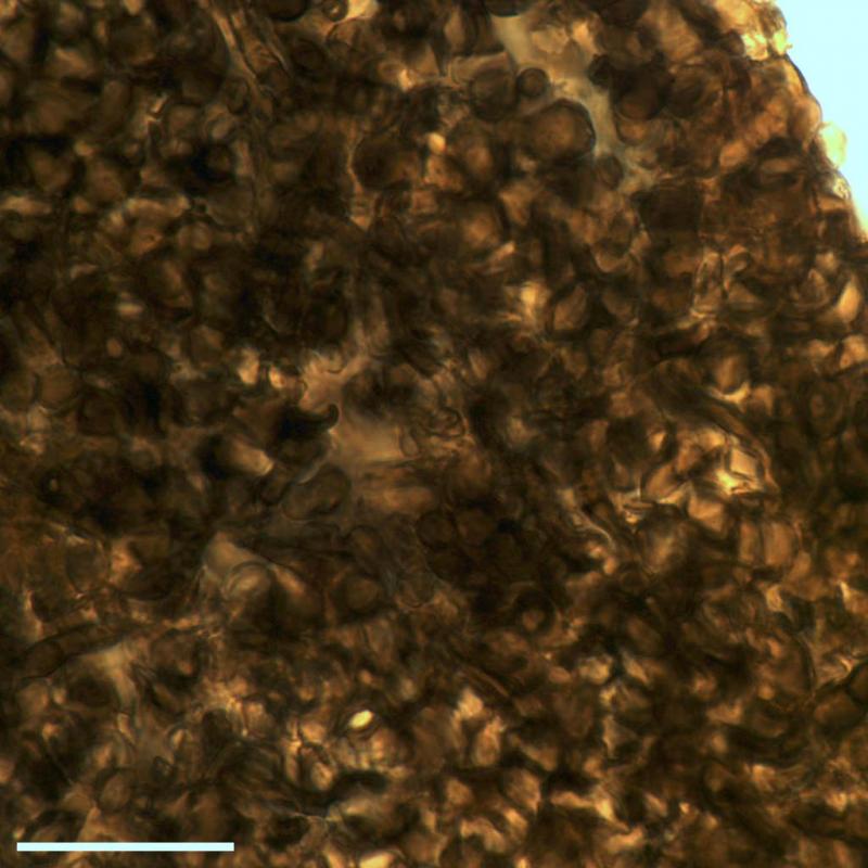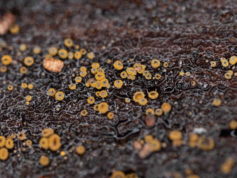 Coccomyces sp. on fallen Rhododendron leavesPretty