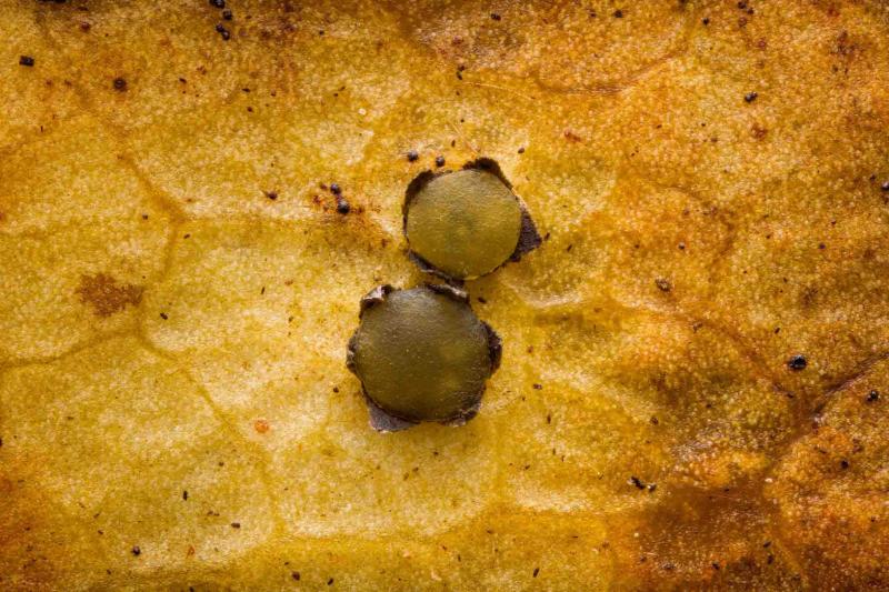 Coccomyces sp. on fallen Rhododendron leavesPretty