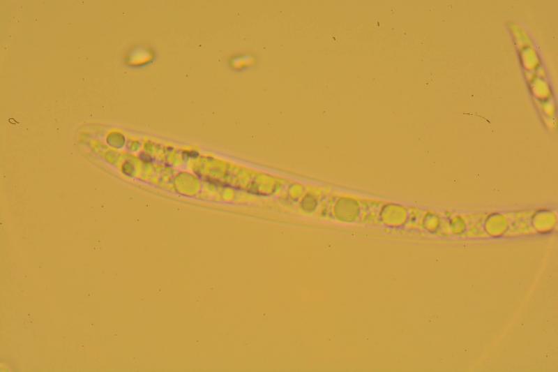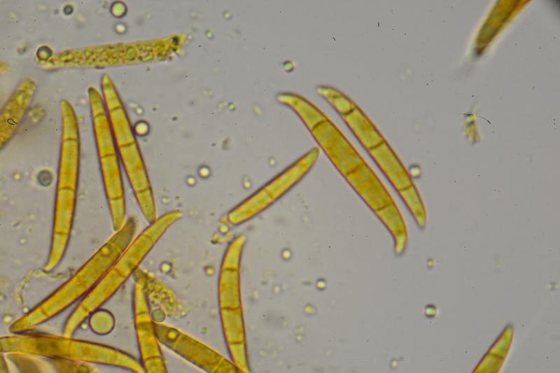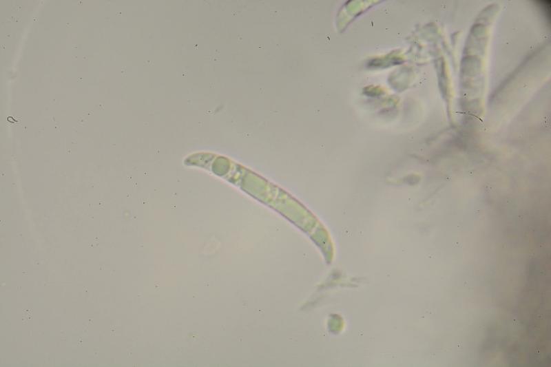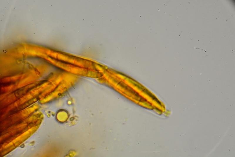 I haven't observed any reaction of the asci apex in Baral's solution. I haven't obtained any free spore print. Spores with 3 septa measured in water: