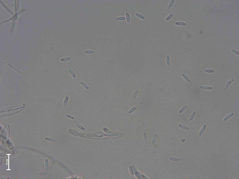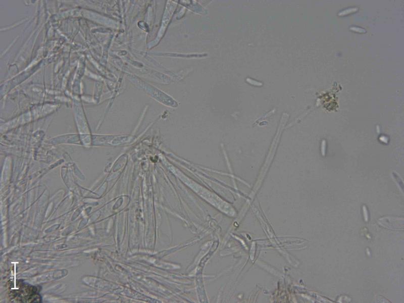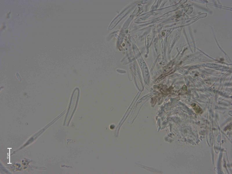 Disc 0.3 mm diam., grey-brown, surrounded by dark hyphomycete. Microscopy based on water mount of fresh material found in September 2025: Hairs hyaline, thin-walled, cylindric, straight, blunt, 3-septate, 63-83 x 2,3-3,0 µm. Minor amount of light-colored exudate may be observed on the upper part of some of the hairs, however, hard to confirm with certainty. Based on the macro-photo, the hairs look glued together into larger units. Asci 37-44 x 4,1-5,4 µm, cylindric, without croziers based on my interpretation. Sp. 6,6-7,7 x 2,1-2,6 µm; Q=2,7-3,3.