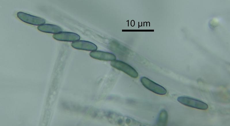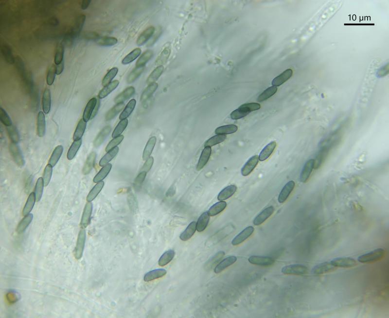 Spores: 7.5–9.7 × 2.6–2.9 µm, turning greenish-blue in 3% KOH