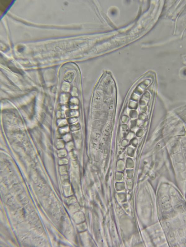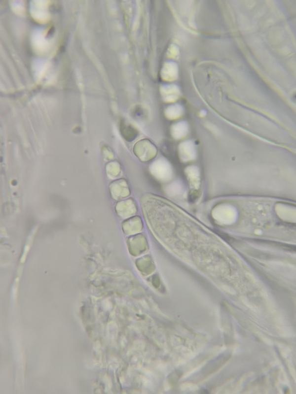 Spores 35-45 x 4.5-7 and 5-7 septate, aseptate as young.
