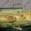 Ap. 0.5-1.5 mm diam. Asci without dome, IKI-. Sp. *(8.5-)10-12(-14.5) x 2.8-3 µm, large LB 1.2-1.6 µm diam, often also 1 terminal LB 1-1.2 µm, and some minute, not germinating, no septum in senescent apothecia. Hairs light sulphur-yellow throughout. Paraphyses (dead ) distinctly warted.