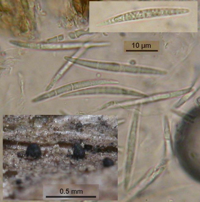 Perith. assoc. with loose black setae of Brachysporium sp., partly on perithecia!, globose/acute-conical, solitary, scattered, superf., ca. 0,2 mm diam. Sp. longfusoid, somet. falcate, CRB-, *29-34 x 2,5-2,9 µm, lipid content 5, hyaline, 3-septate (septa distinct only when dead), not constricted at septa, 4 nuclear areas, multiguttulate (large LBs ca.1 µm & minute LBs), Asci with small apical ring (1,5 µm diam.), IKI-, no wall thickenings.