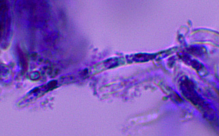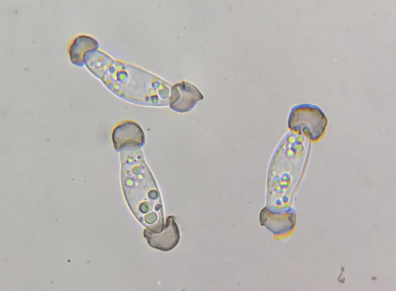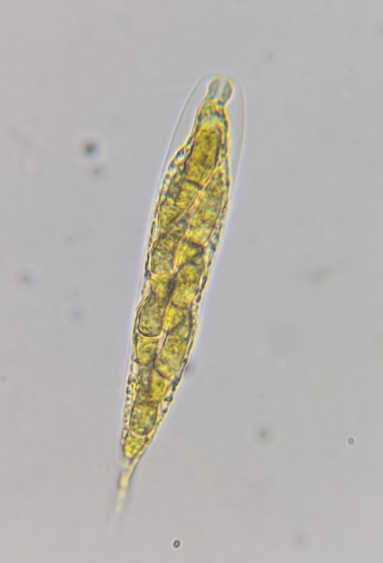 Spores, submedian septa, polar appendages, 18,7-21,2 x 6,4-6,7um, appendages 6,7-7,3 x 5,1-5,9um.