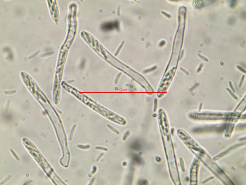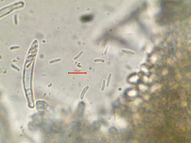 Of what I believe are two distinct ophiostomatoid fungi shown, the larger of them is the target organism, and it is spores from this fungus which are shown in the micrographs and in the measurements below.