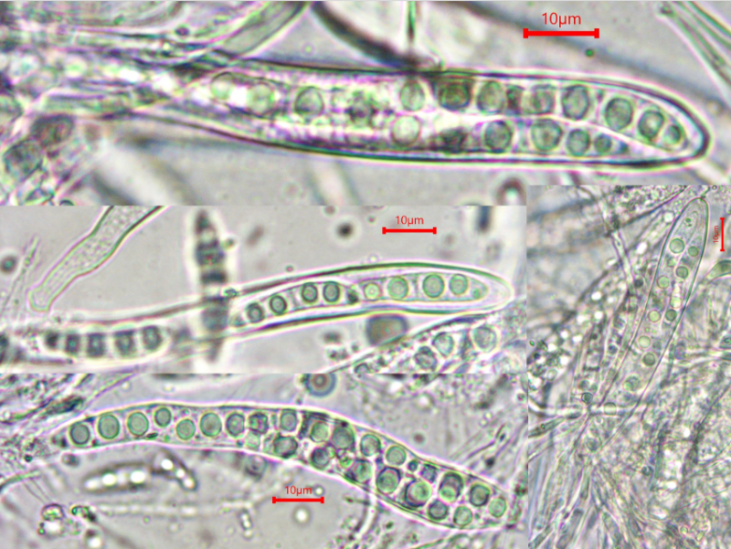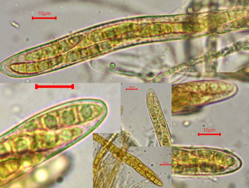 The spores are oil-rich, with mostly 4 large guttules, and measure about 22-28/4-5 µm, they are 1- or mostly 3-septate already within the asci. Old spores found outside sometimes germinate at their ends like a Rutstroemia. I never saw this in Mollisia (?).