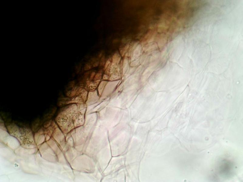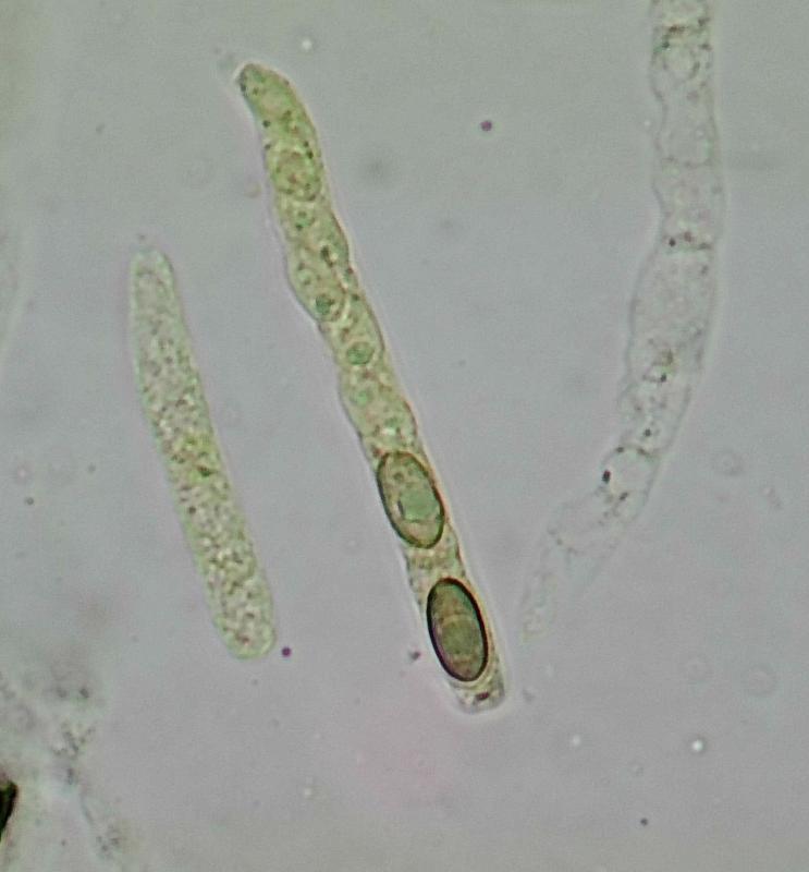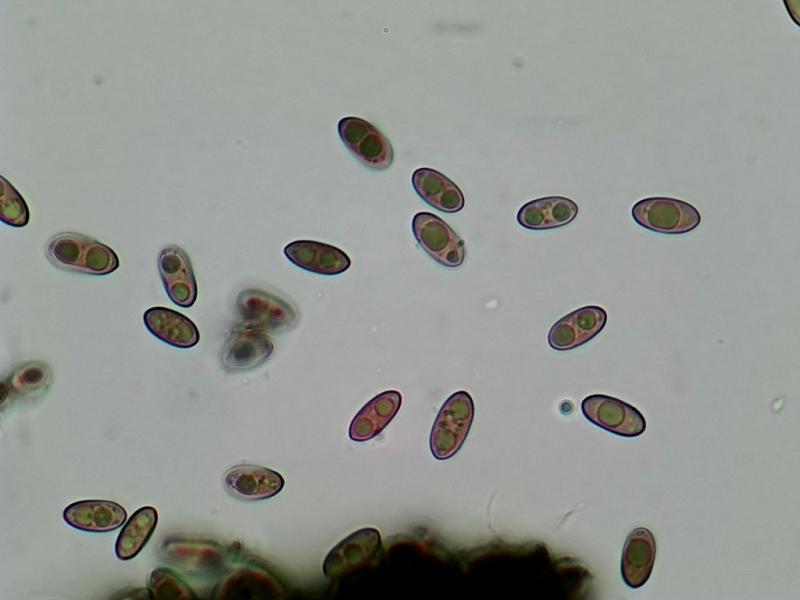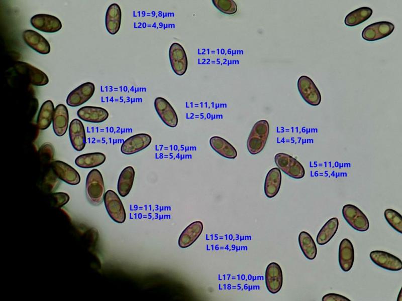 Spores brunâtres à deux grosses guttules (plus rarement une seule centrale), 10-11 X 5-5,5µ (sur sporée).