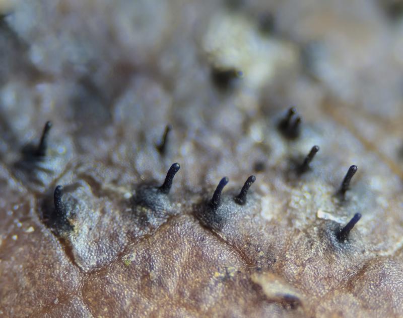 Growing on overwintered Acer leaves, Quebec, Canada.