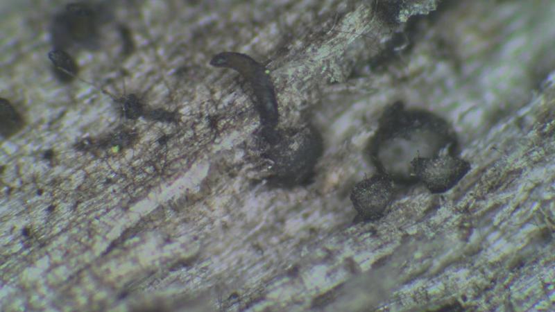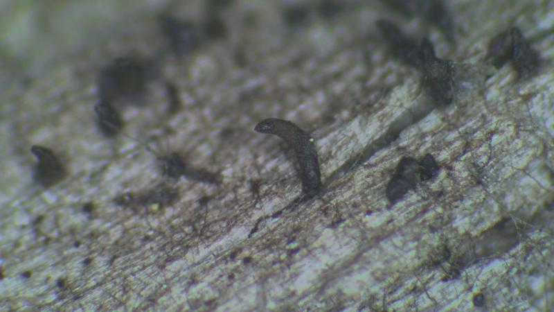 Périthèces noirs immergés à long col, jusqu'à 1mm au total.