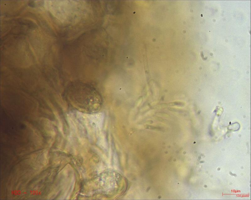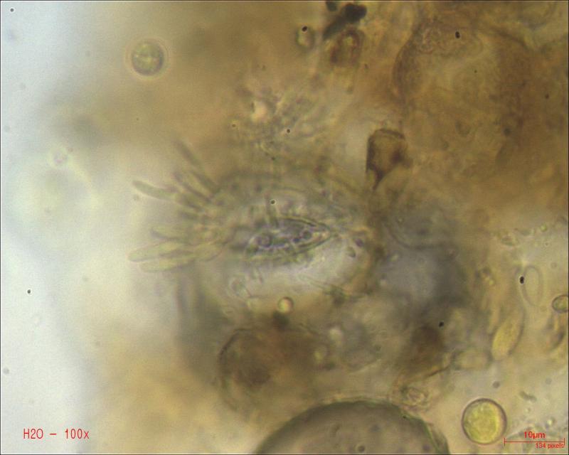 The asci are large, about 100-150/11-12 µm (few measured), and bear croziers. They are ioidine-negative in Baral.