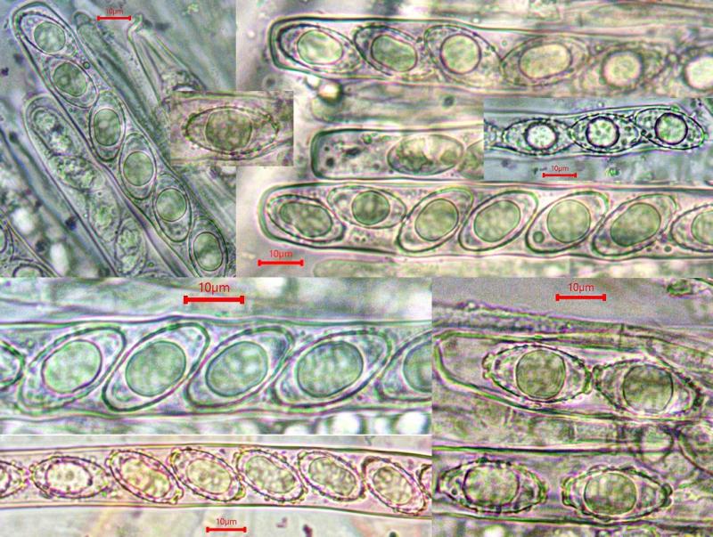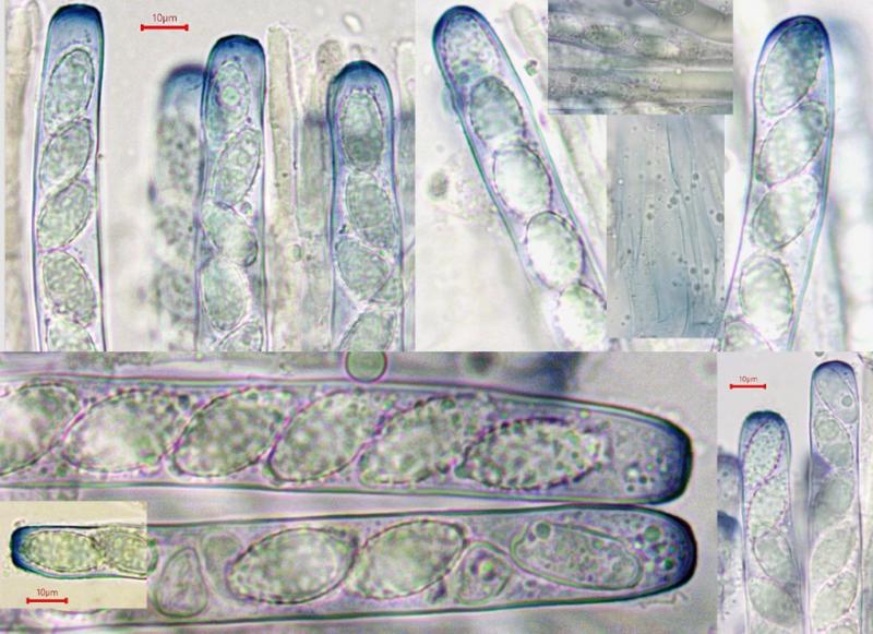 translation: perithecia [pseudothecia] lentiform, granulose, immersed in loosening bark. Asci 120-130 µm long, 8-spored. Ascospores golden, 20-30 x 7-8 µm, 7-9 septate with a swollen 3-4 cell.