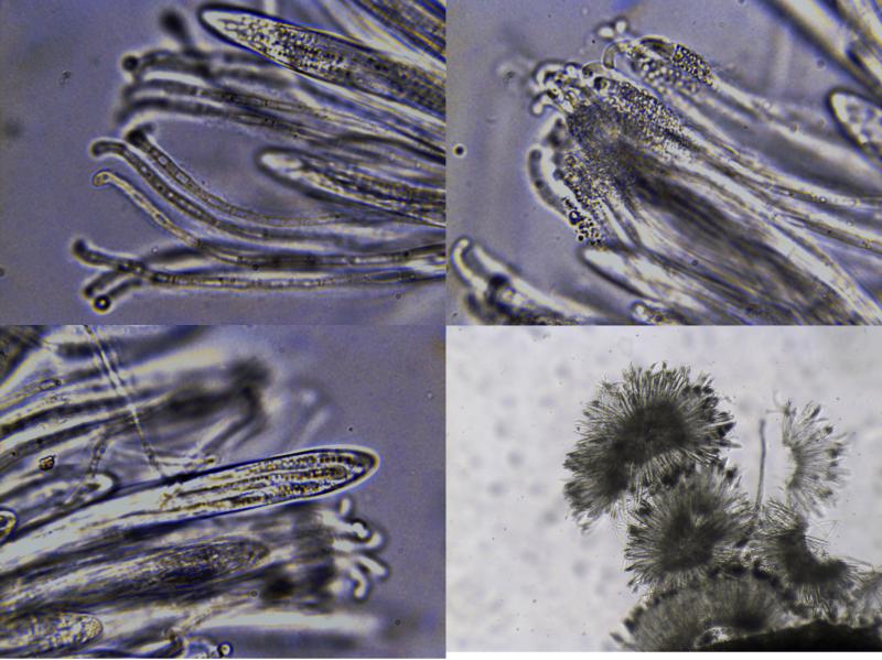 Asque à crochet, 40-50 X 5-6 µ, 8 spores bisériées, en apex en bleu sombre au lugol (pas évident),