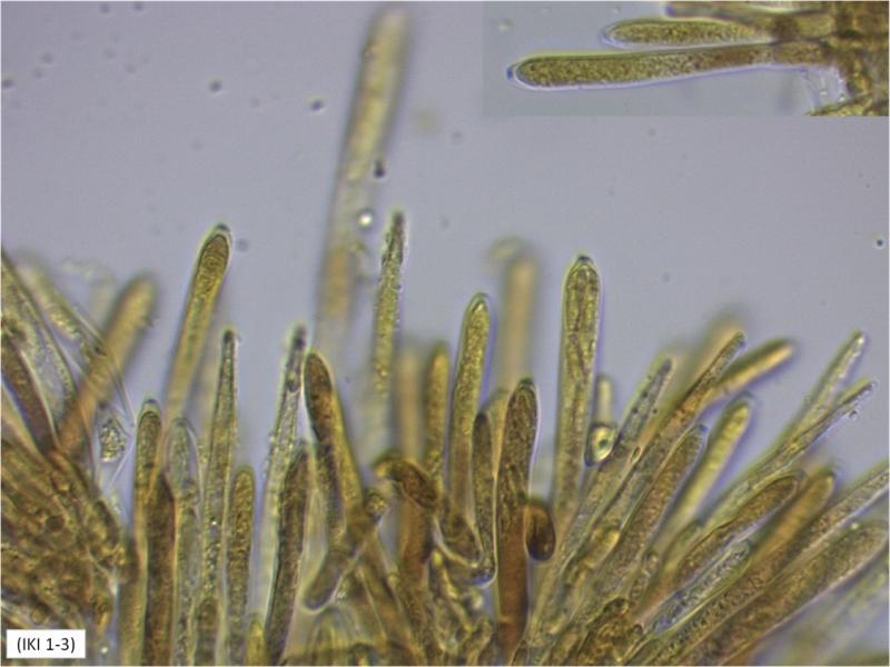 I collected this in the Netherlands, on the base of Populus on wood among grass. The ascomata are up to 0.8 mm wide. The hypothecium is brownish, unchanging in K (pictures are in water). The hamathecium reacts blue with K/I, without a blue tholus.