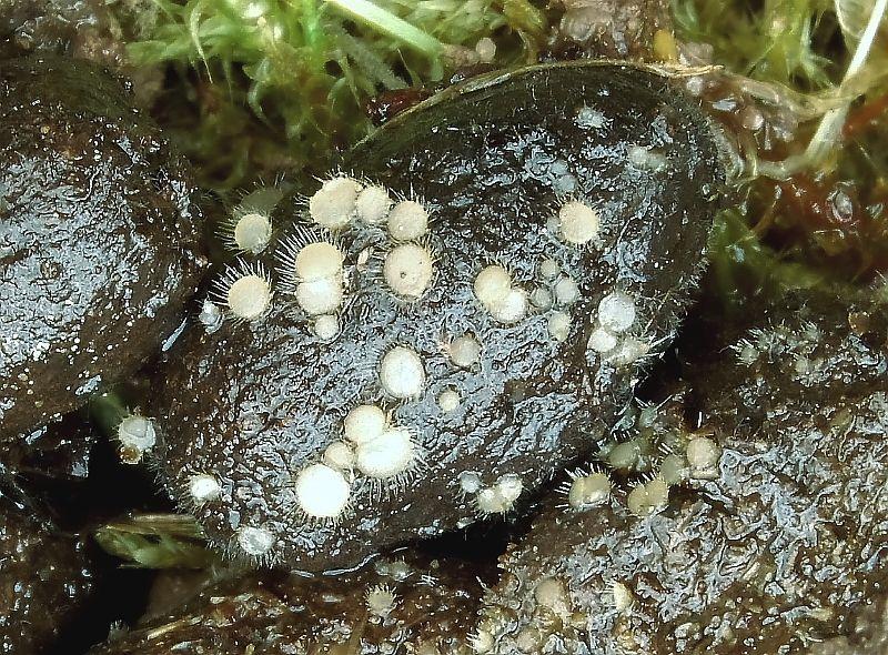 Pycnides aplaties, plus ou moins en lignes, -> 1/4 mm, noirâtres, plus ou moins striées, immergées à ostiole affleurante.