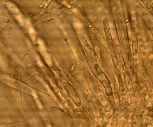 Ascas de (26,30) 27,48 - 32,66 (36,91) x (3,53) 3,83 - 4,50 (4,58) µm; Me = 29,66 x 4,06 µm, octospóricas, uniseriadas, no amiloides (Hay algunas ascas que parecen estar más inmaduras, algo más largas, que sobresalen 10 µm aproximadamente por encima de las que he puesto medidas). Esporas compuestas de dos células de aproximadamente 2,40 x 2,00 µm cada una (solo he visto una fuera de las ascas), muy refringentes. No he observado paráfisis.