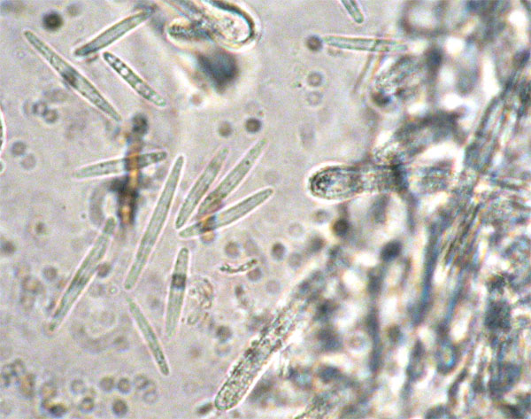 Spores ellipsoïdes, lisses, biguttulées, 13-15 x 7-8,5 µm, 13,8 x 7,7 µm en moyenne (10 spores), Q = 1,79